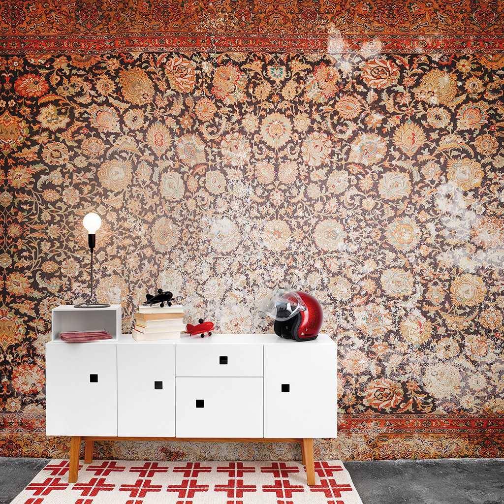 Das Wandbild The Old Rug erinnert an die Pracht traditioneller Orientteppiche. Fein ausgearbeitete Ornamente in warmen Rot-, Gold- und Erdtönen entfalten auf der Wand eine lebendige, zugleich nostalgische Ausstrahlung – wie ein textiles Kunstwerk mit gelebter Patina.