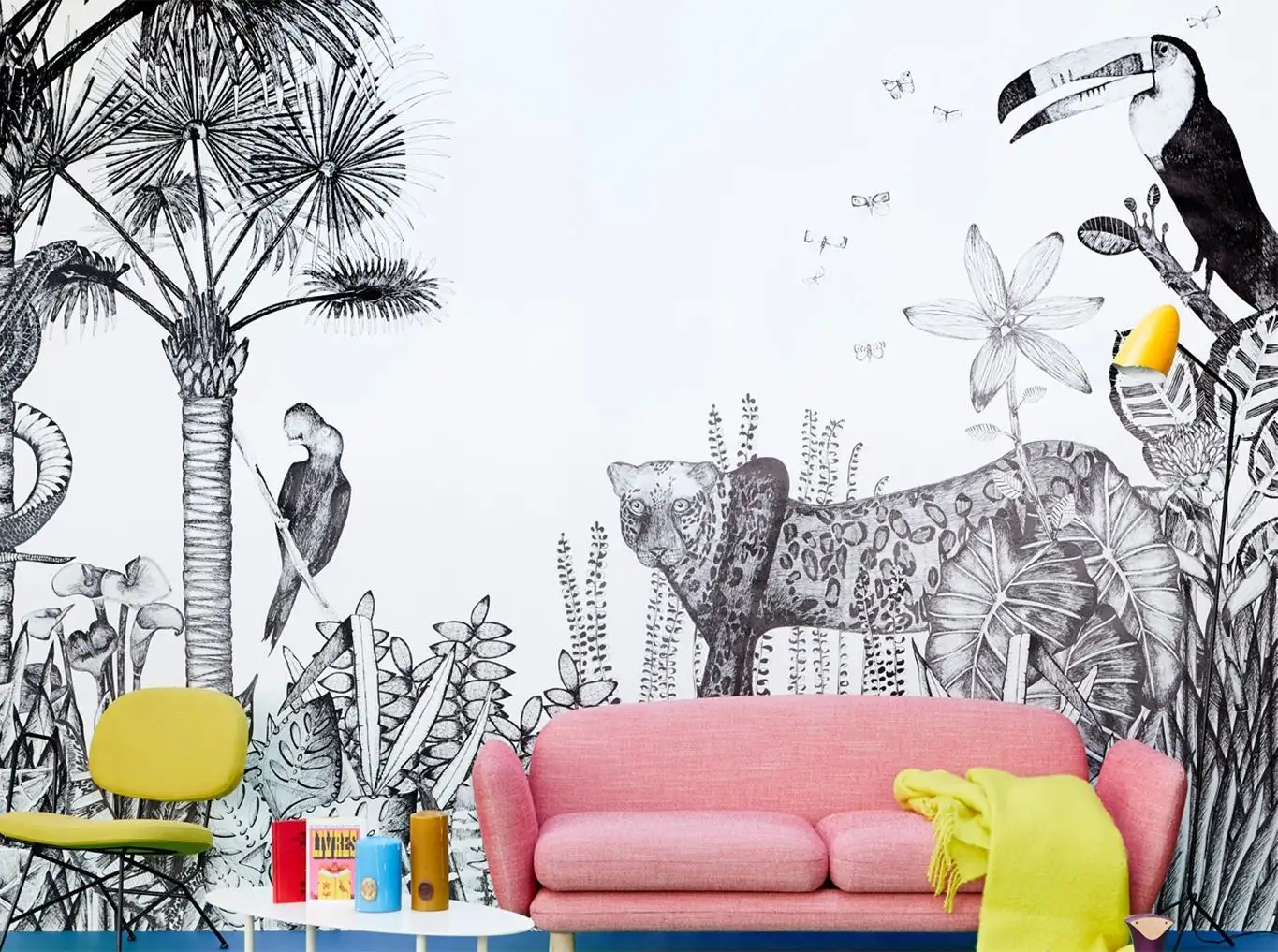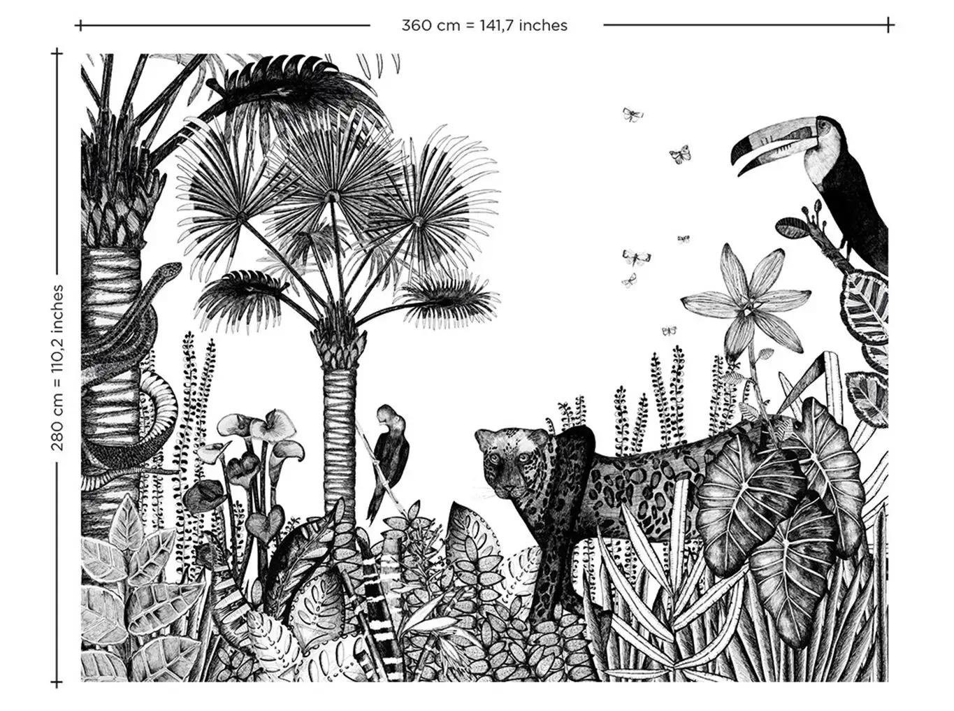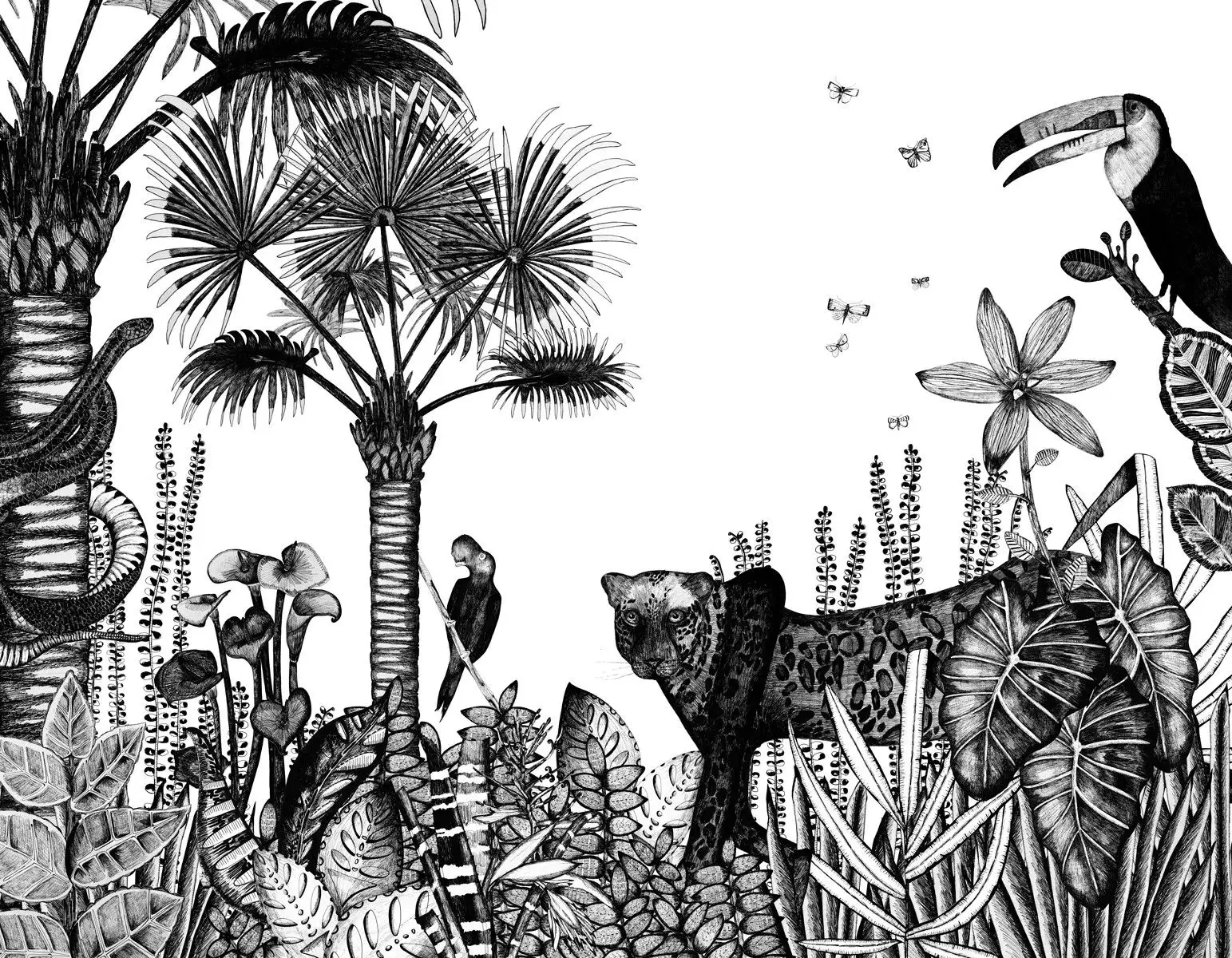 Inspiriert von Rousseau, zeichnet dieser üppige und naive Dschungel in schwarz-weiß eine starke und frische Exotik ab.
