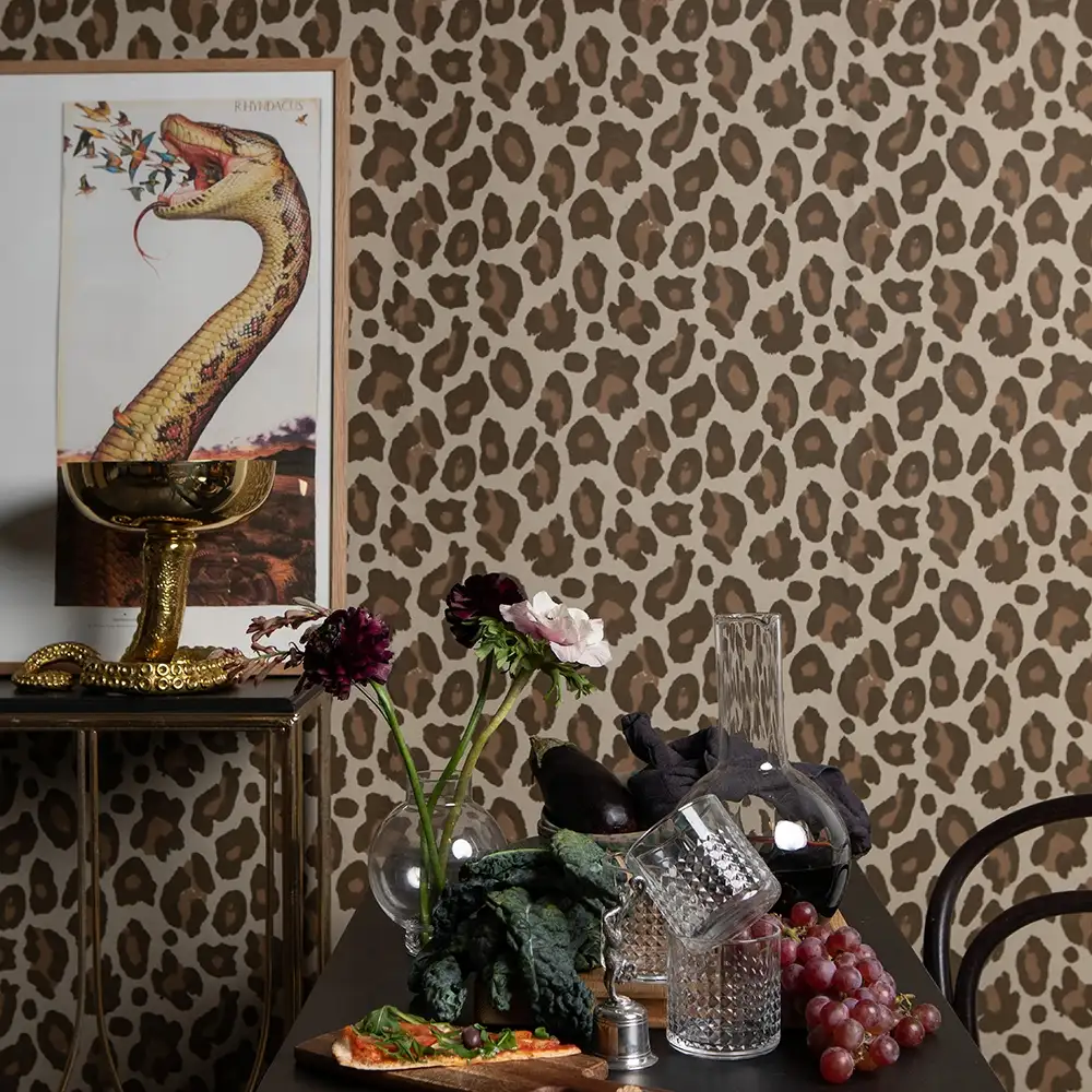 Die Tapete This is it in den harmonischen Brauntönen passt zu Holzmöbeln ebenso wie zu modernen glatten Flächen in Weiß und Schwarz. Kombinieren Sie die wie ein echtes Fell wirkende hochwertige dimensionsstabile Tapete mit Regalen und Tischen aus Glas und Stahl und genießen sie die wärmende Wildheit des Leoparden.