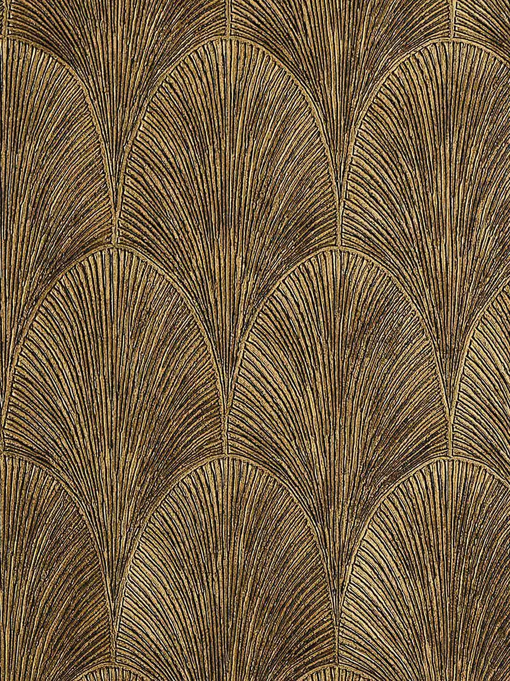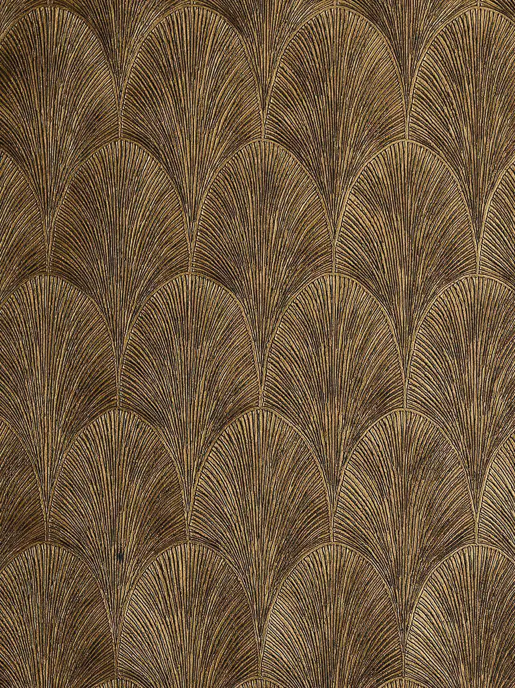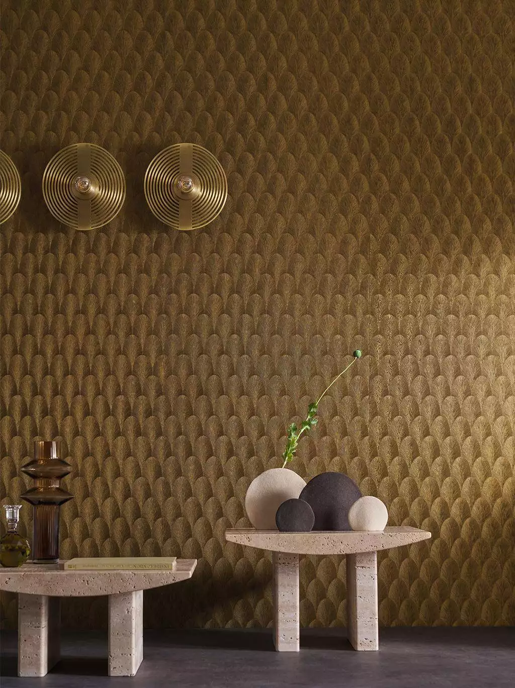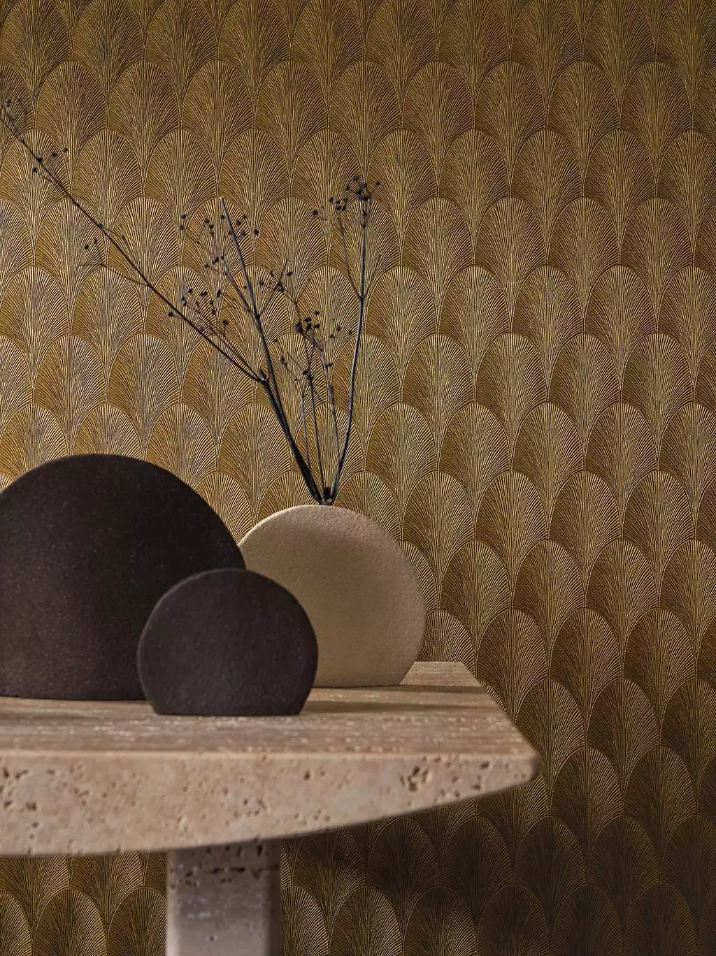 Feine Palmblätter treffen auf metallischen Schimmer bei Tourmaline col. 08. Das ornamentale Muster ist zeitgenössisch und von Naturformen inspiriert, fast wie geprägte Mineralien. Das Licht tanzt auf der Oberfläche. In gedecktem Farbton mit warmem Glanz prägt dieses Design den Raum mit Tiefe und organischer Eleganz.