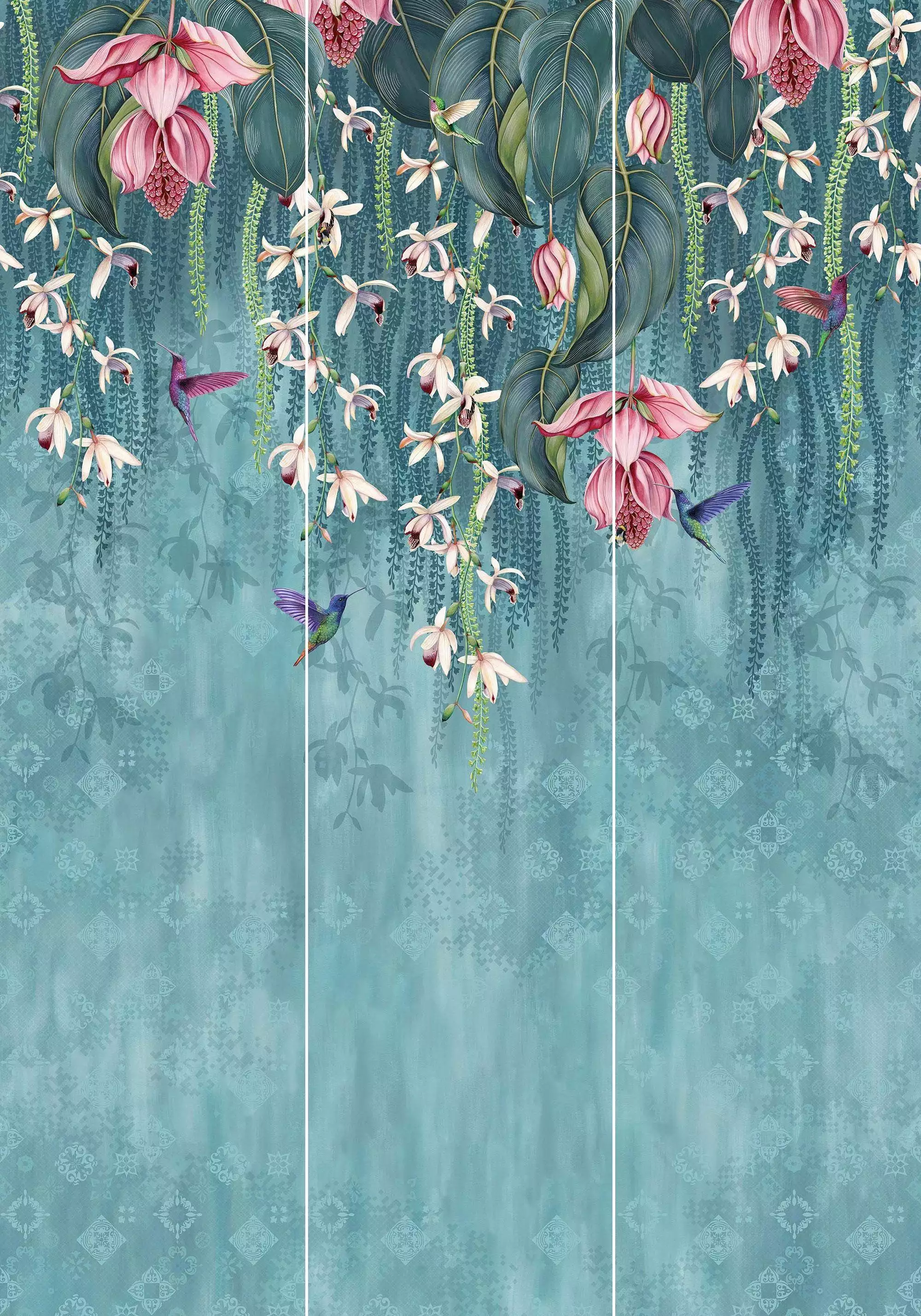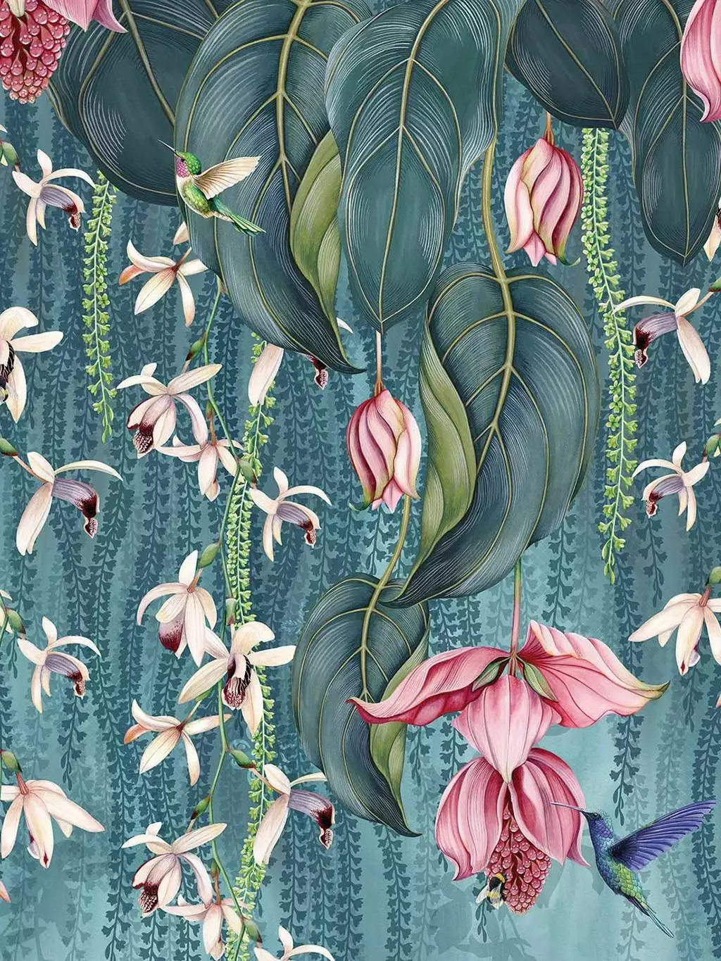 Trailing Orchid zeigt hängende Orchideen, Kolibris und dichtes Blattwerk. Das großformatige Wandmotiv in Türkis und Grün mit rosa Blüten verbindet kräftige Farben und feine Details zu einer klaren, exotischen Gestaltung.