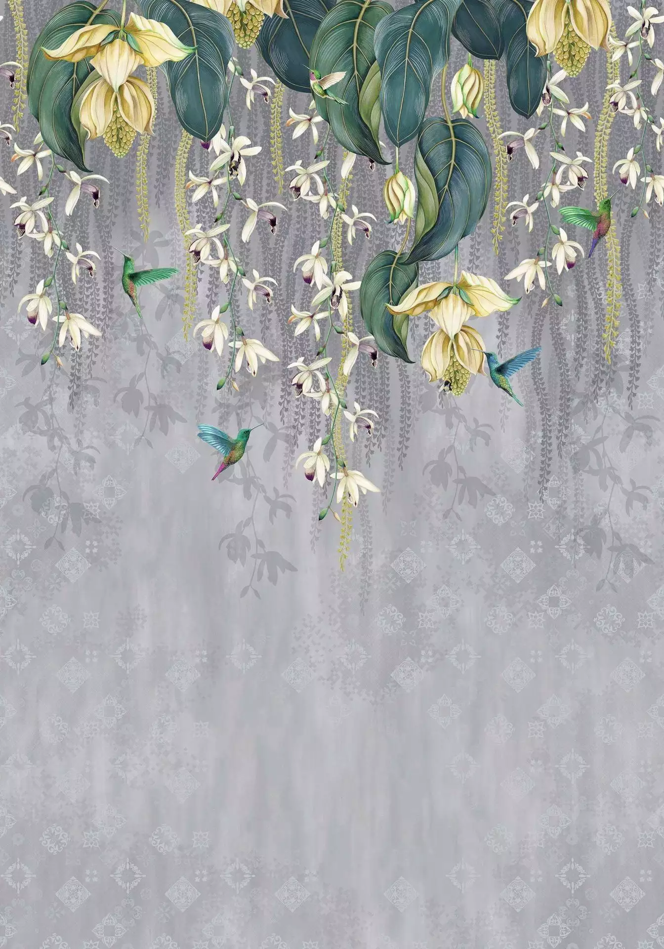 Trailing Orchid zeigt hängende Orchideen und Kolibris auf einem grauen Fond mit feiner Ornamentstruktur. Die Kombination aus kühlen Grau- und Grüntönen mit zartem Gelb und Weiß wirkt klar und ausgewogen. Ein dekoratives Motiv mit ruhiger, exotischer Anmutung. Im Raumbild sind ggf. mehrere Motive abgebildet.