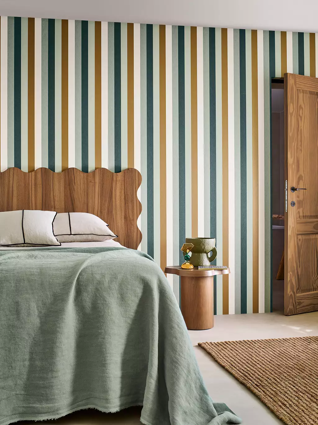 Elegante Streifentapete aus der L’Île aux Oiseaux Kollektion von Casamance, inspiriert von Küstenlandschaften und dem Zauber der Natur. In harmonischen Farben wie Türkis, Dunkeltürkis, Ocker und Creme gehalten, strahlt sie zeitlose Leichtigkeit und stilvolle Ruhe aus.