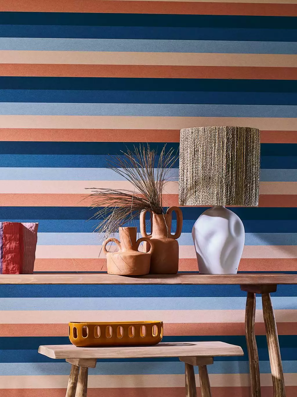 Die Tapete Transat aus der Kollektion L’Île aux Oiseaux von Casamance zeigt elegante Streifen. Die Farben reichen von Nude und Holzrosa über zartes Hellblau und Marineblau bis zu kräftigem Nachtblau. Die verschiedenen Blautöne wirken klar und fördern Entspannung. Die warmen Rosétöne erzeugen gleichzeitig Energie und Freundlichkeit.