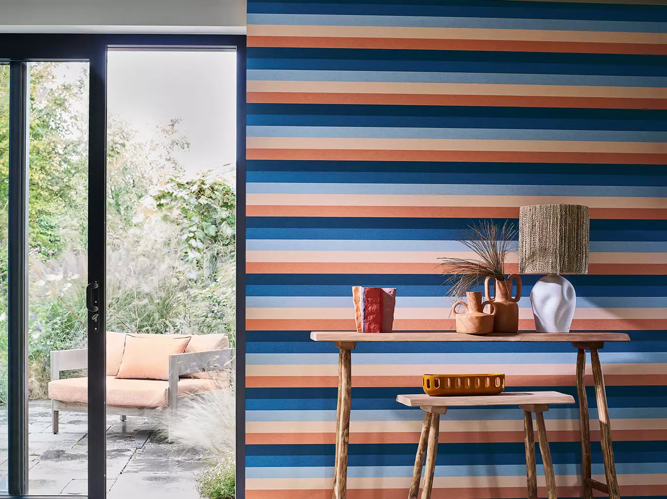 Die Tapete Transat aus der Kollektion L’Île aux Oiseaux von Casamance zeigt elegante Streifen. Die Farben reichen von Nude und Holzrosa über zartes Hellblau und Marineblau bis zu kräftigem Nachtblau. Die verschiedenen Blautöne wirken klar und fördern Entspannung. Die warmen Rosétöne erzeugen gleichzeitig Energie und Freundlichkeit.