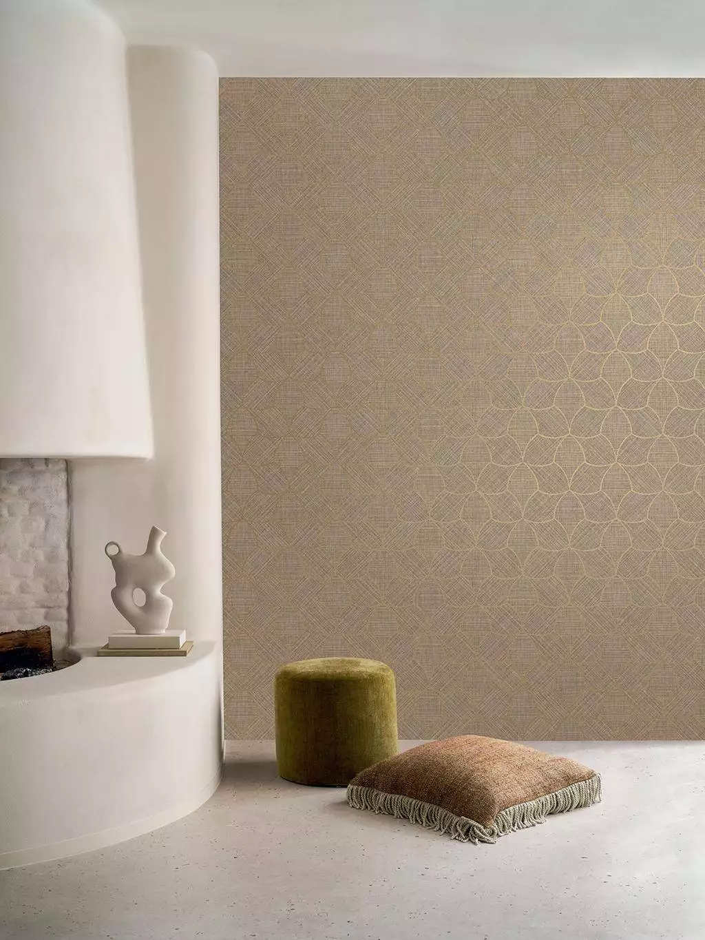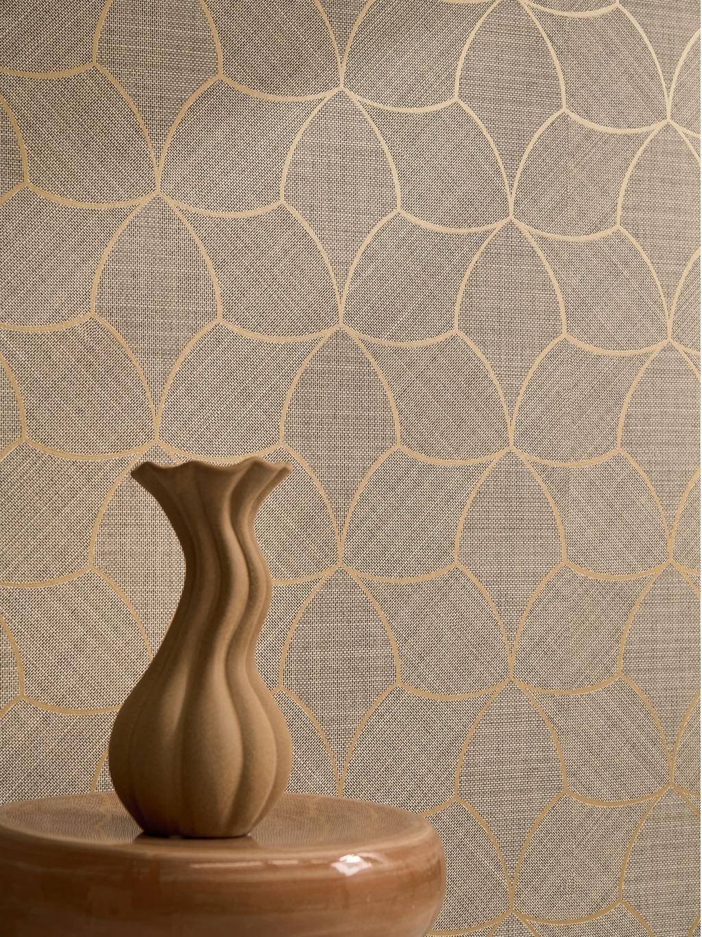 Hochwertig, warm und modern bringt die Designtapete Tressana die Idee traditioneller balinesischer Einlegearbeiten und Korbflechterei mit sehr besonderer Wirkung in den Raum – ruhig, organisch und hochwertig. Fein gewebte Fasern sind in wechselnden Winkeln gelegt und erzeugen eine ästhetische Bewegung auf der Wand wie ein lebendiges Relief: sanfte Lichtwechsel, dezente Schatten, ein Spiel aus Struktur und Tiefe. Metallische Waben geben dem textilen Charakter einen eleganten Rahmen. Für uns ist klar: Mit der Tapete Tressana darf kultivierte Materialität in Räume einziehen, in denen sich Architektur und Interior veredeln.