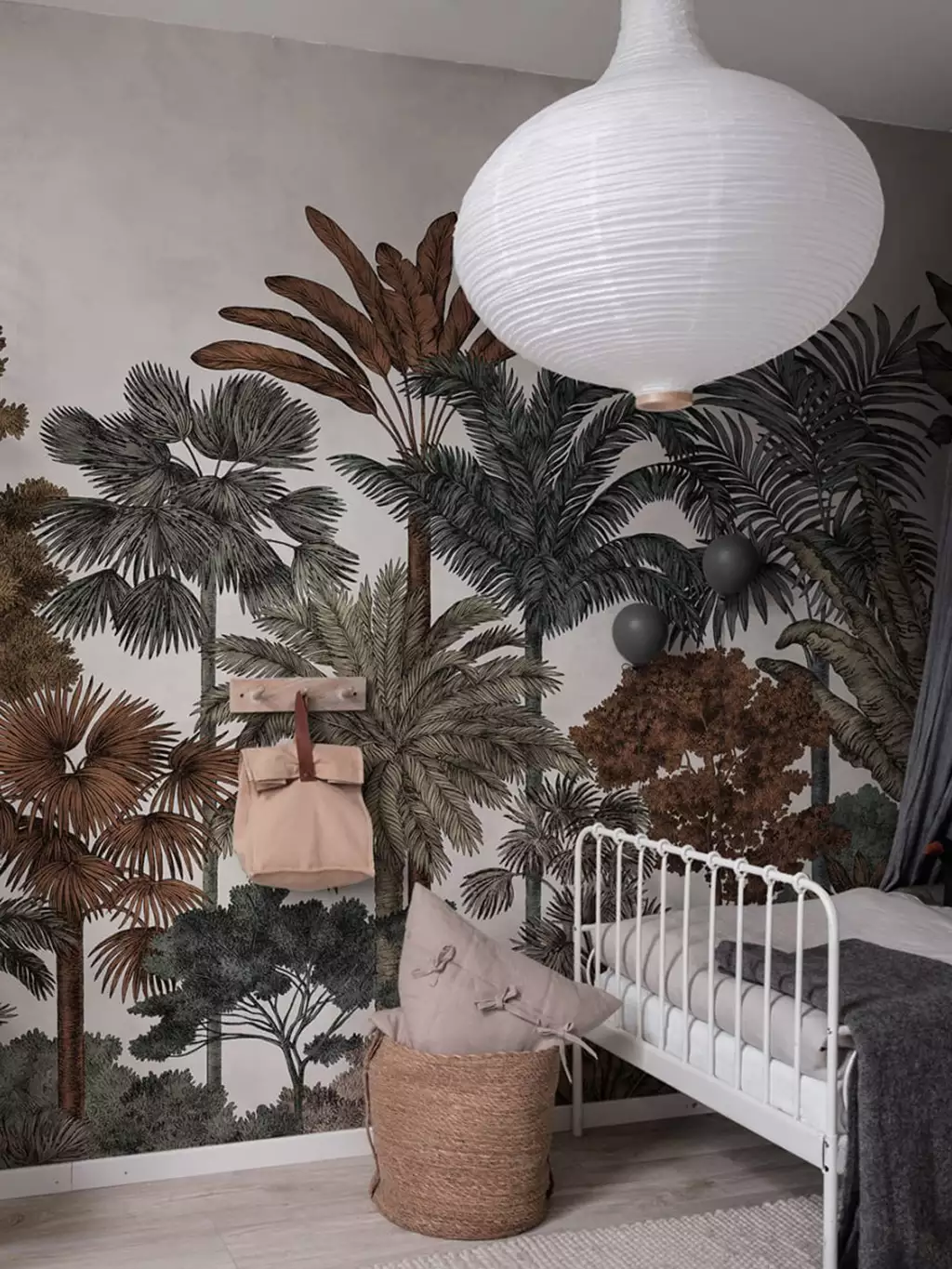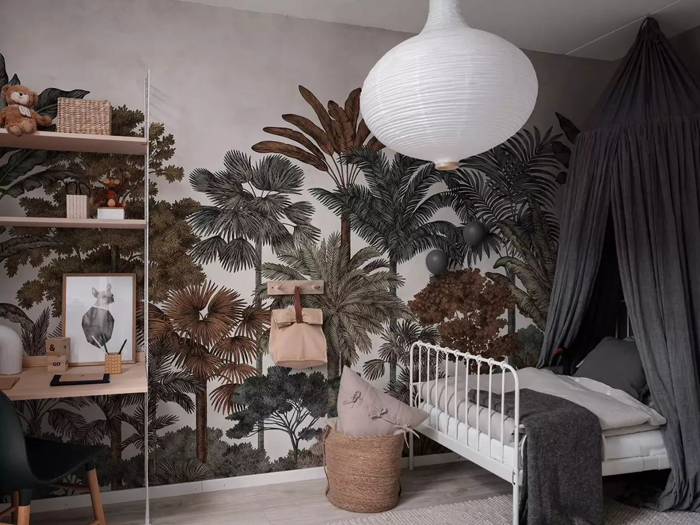 Willkommen in einer Welt voller exotischer Schönheit und üppiger Vegetation. Mit unserem floralen Wandbild bringen Sie die wilde Schönheit des Dschungels direkt in Ihr Zuhause. Das Tapetendesign zeigt eine prächtige Waldlichtung, die von üppigen Palmen umgeben ist. Es ist eine Hommage an die Schönheit der Natur und ein Fest für die Sinne.