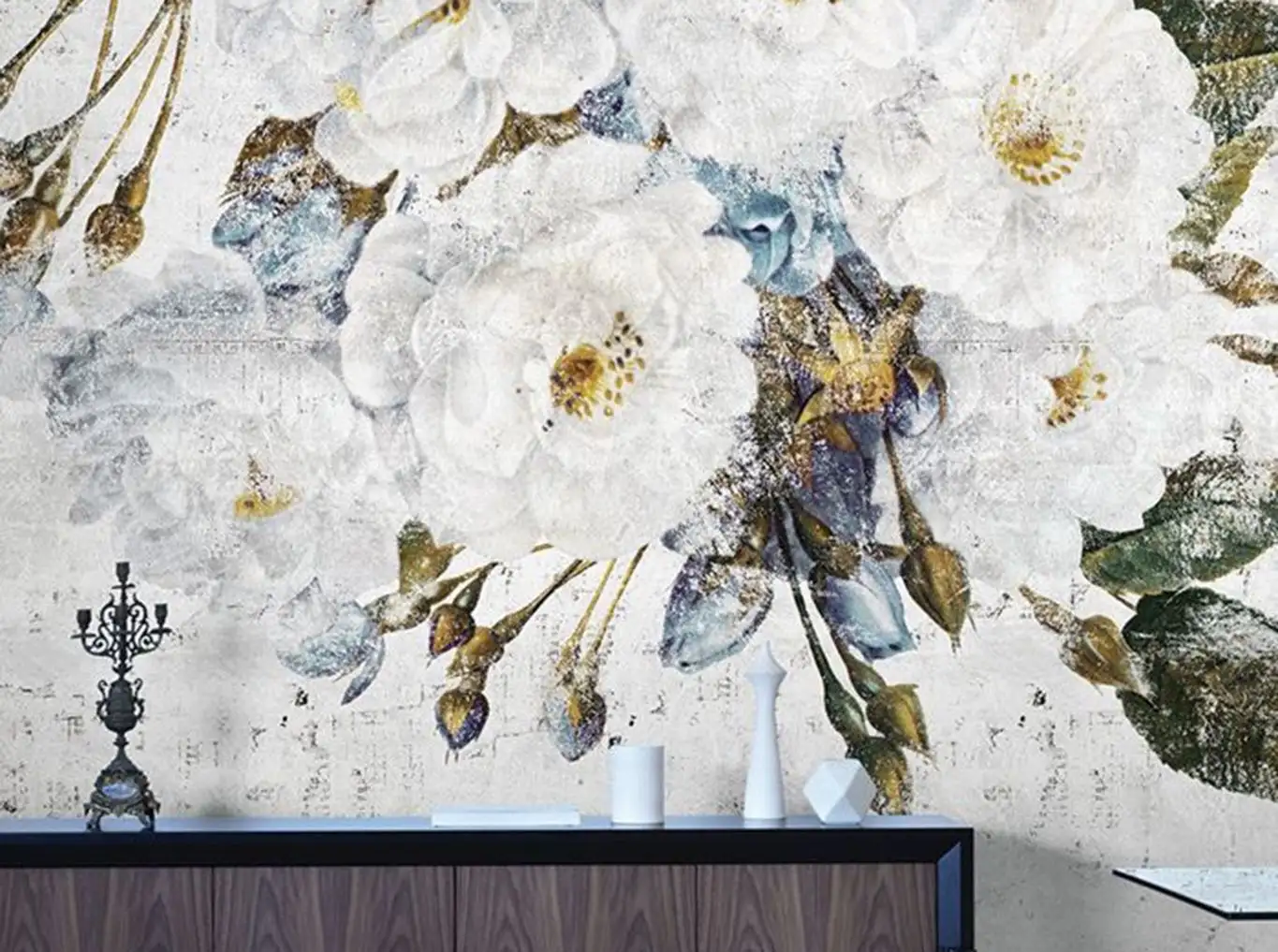 • Großformatige Muster, warme Farben und dezente Metallic-Effekte, die Tiefe und Eleganz schaffen