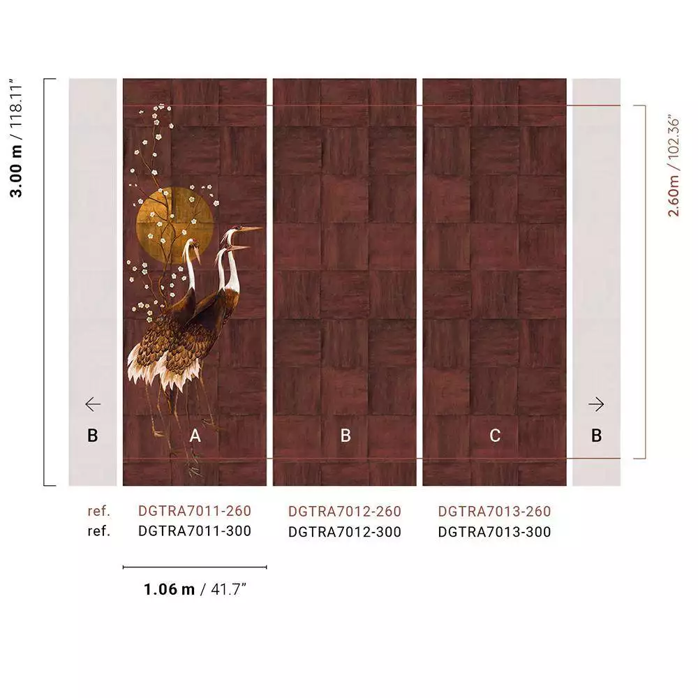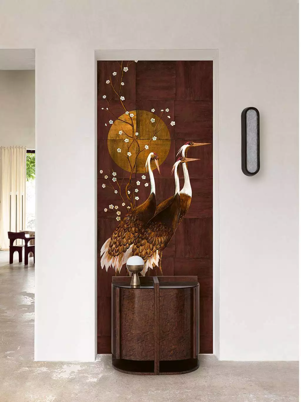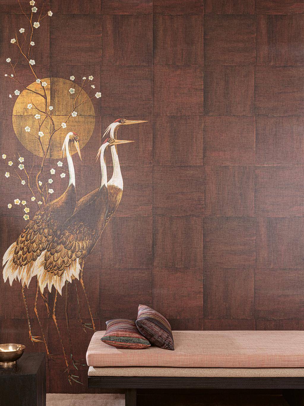 Die Tapete Tsuro schenkt der Seele Ruhe und vereint dabei die drei Säulen der Kollektion Traces auf würdige Weise: art, nature, roots. Kunst, Natur und Wurzeln. Das Wandbild zeigt drei Kraniche, die still und würdevoll beieinander stehen wie Wächter der ruhigen Landschaft. Ihr Blick geht in die Ferne. Ein Moment der Stille, festgehalten in Raum und Zeit. Das Bild bringt Ruhe und Harmonie in den Raum und lädt ein, durchzuatmen und anzukommen. Die Kraniche strahlen würdevoll Gelassenheit aus. Der blühende Sakura Zweig erinnert an Neubeginn und Hoffnung. Das warme Licht im Hintergrund gibt Geborgenheit. Die Tapete Tsuro schafft einen Ort, an dem man sich geschützt und zentriert fühlt.