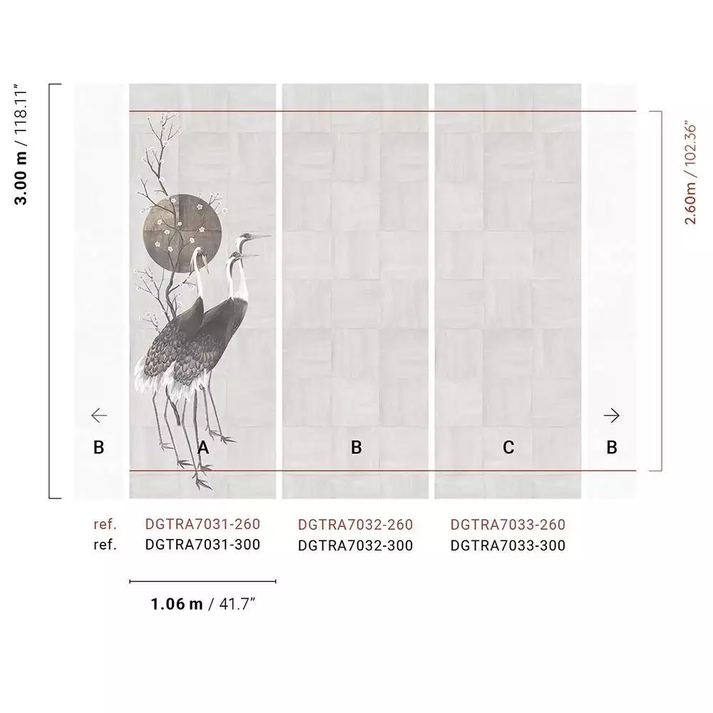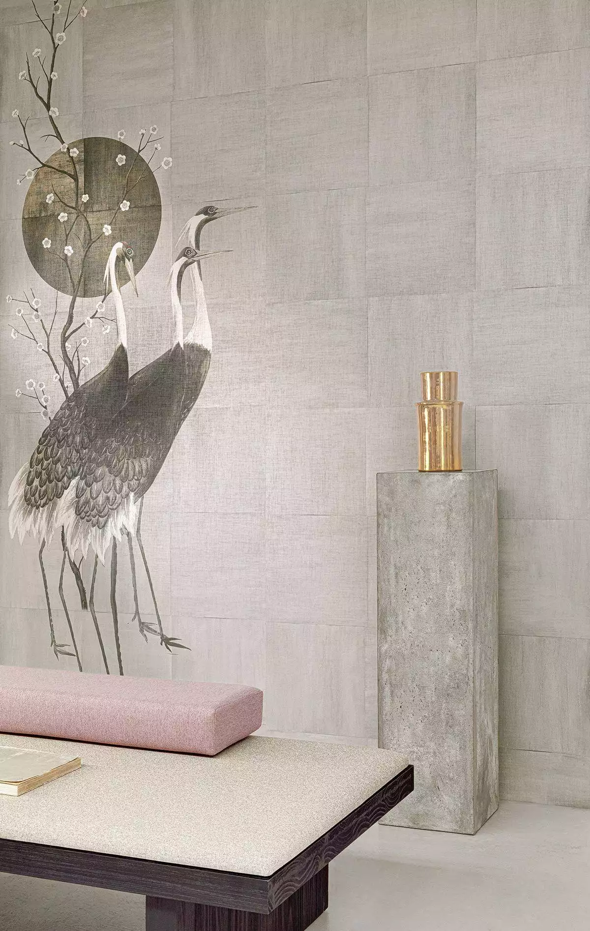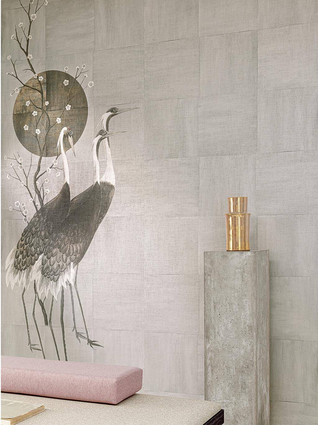 Stellen Sie sich vor, Sie treten in eine sanfte Morgenlandschaft. Die Luft ist klar. Die drei Kraniche stehen würdevoll und ruhig im Raum und wirken wie vertraute Begleiter. Ein zarter Blütenzweig öffnet sich wie ein leiser Gruß des Frühlings. Hinter ihm schimmert ein heller Kreis, der an die erste Sonne erinnert. Die Tapete Tsuro Silver lässt für einen Moment die Welt still werden. Alles fühlt sich weit und ruhig an. Der Raum atmet. Sie atmen mit. Eine schimmernde Motivtapete aus mehreren Bahnen mit feiner Leinentextur und Mica-Finish.