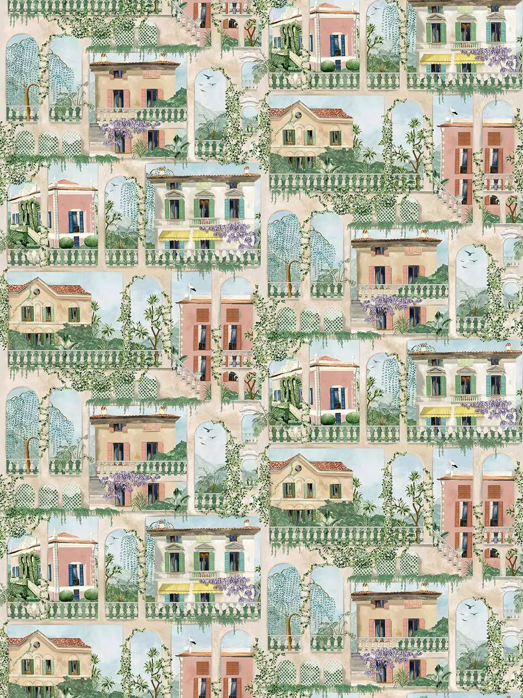 Dieses Muster zeigt wiederkehrende Szenen von traditionellen Villen am Seeufer, die von Steinsäulen, Laub und