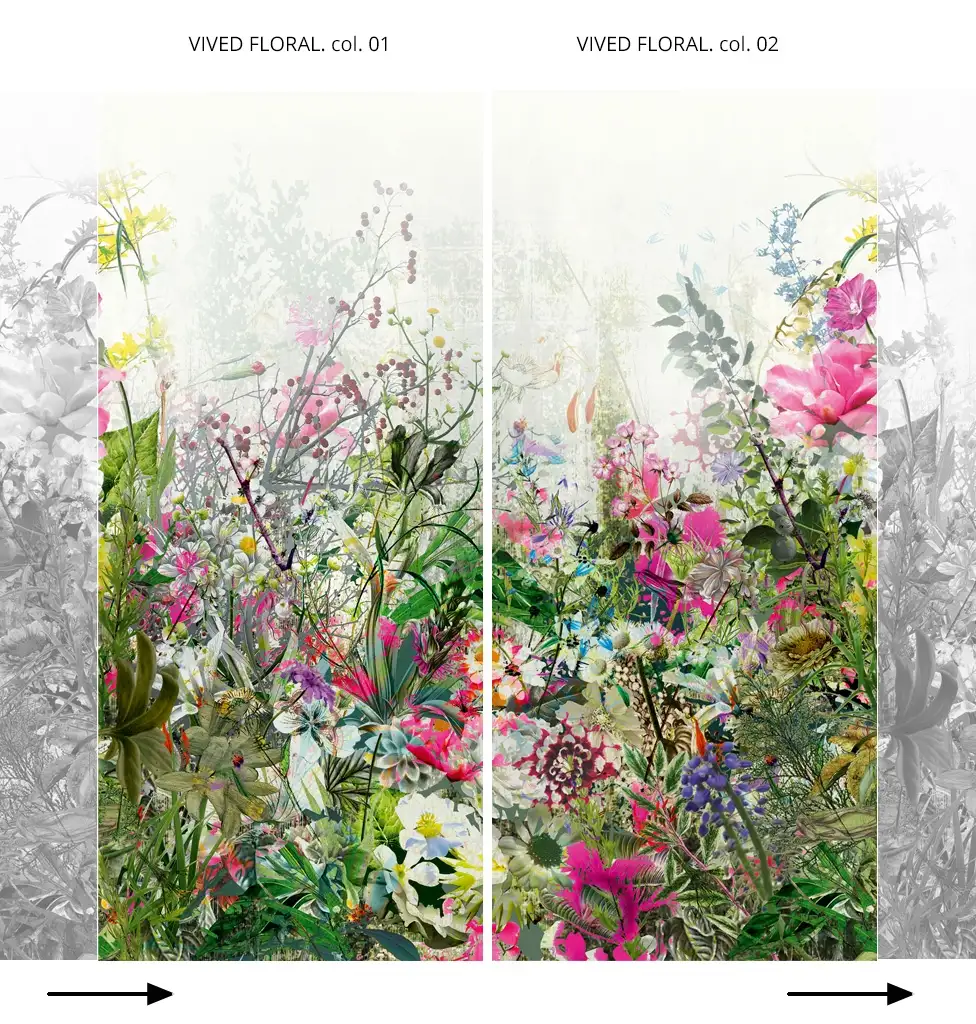 Die Tapete "VIVED FLORAL" erhalten Sie im Online-Shop der TapetenAgentur in insgesamt zwei Variationen. In den Raumbildern sind ggf. mehrere Bahnen verschiedener Artikel abgebildet (zu finden in Varianten). Die 2 Artikel/Bahnen können in der Reihenfolge: col.01 plus col.02 ... fortlaufend kombiniert werden.