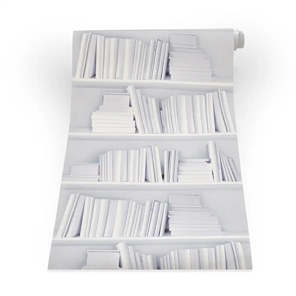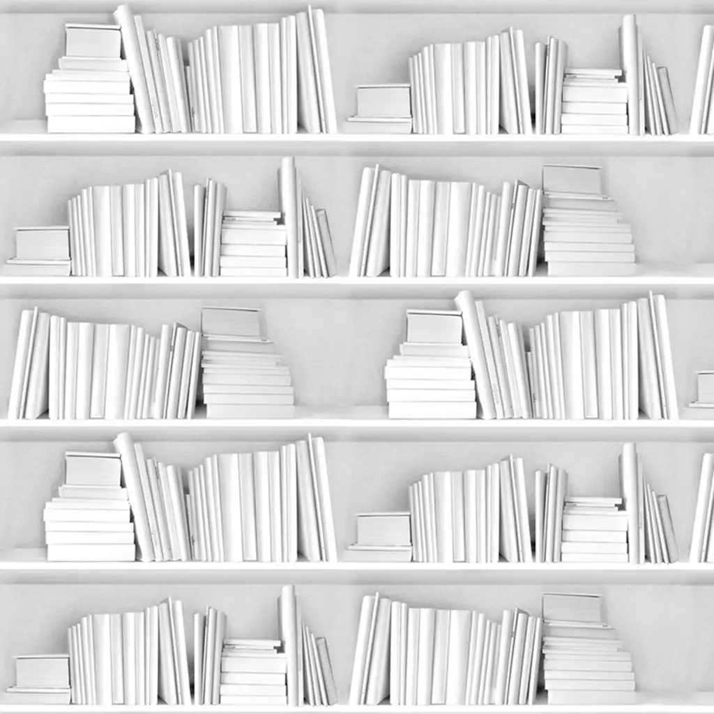 Weiße Bücherregaltapete von Young & Battaglia. Das klassisch zeitlose Design auf strukturierter Vinyl zeigt weiße Bücher in weißen Regalen für einen hellen, minimalistischen Look.