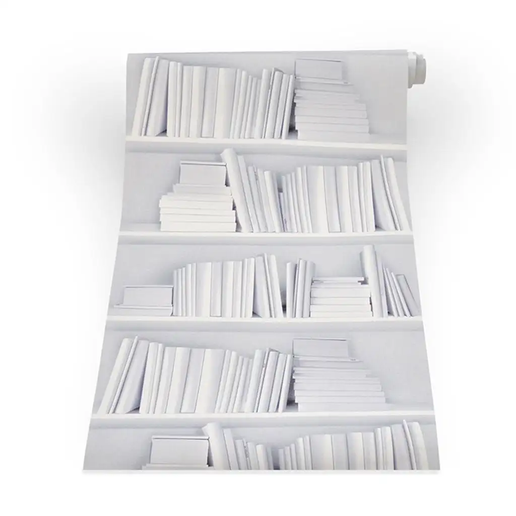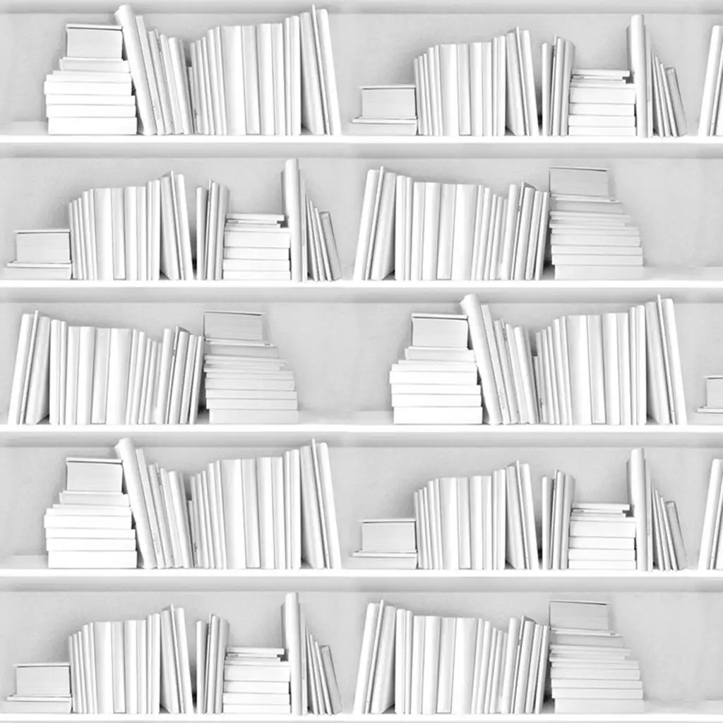 Weiße Bücherregaltapete von Young & Battaglia. Das klassisch zeitlose Design auf strukturierter Vinyl zeigt weiße Bücher in weißen Regalen für einen hellen, minimalistischen Look.