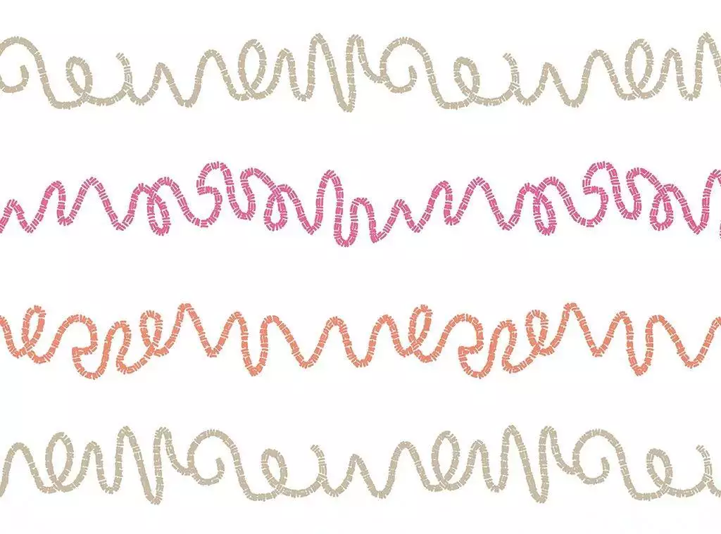 Die Kindertapete "Wiggles Sari" präsentiert ein verspieltes Muster von sich kräuselnden Linien in den Farben Gold, Orange und Rot, die ein horizontales Streifenmuster bilden.