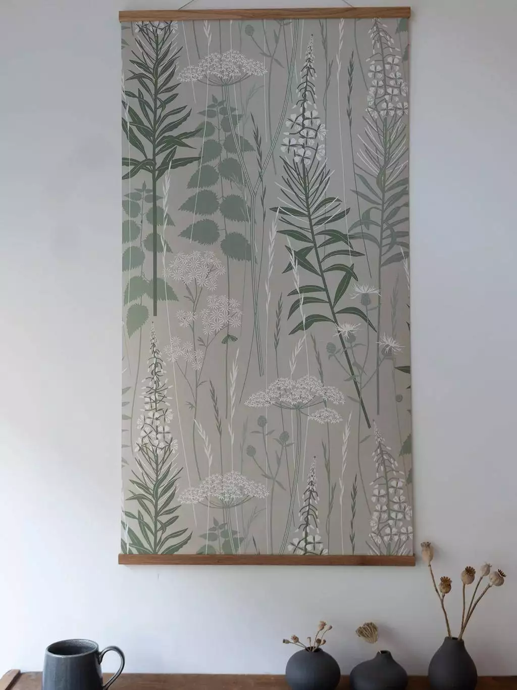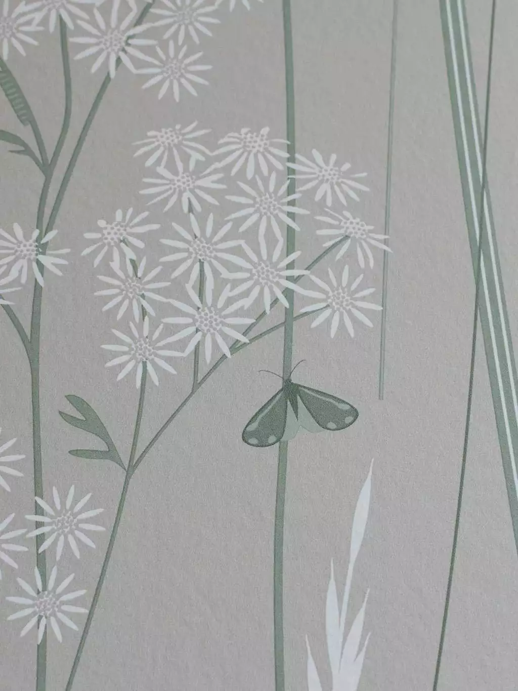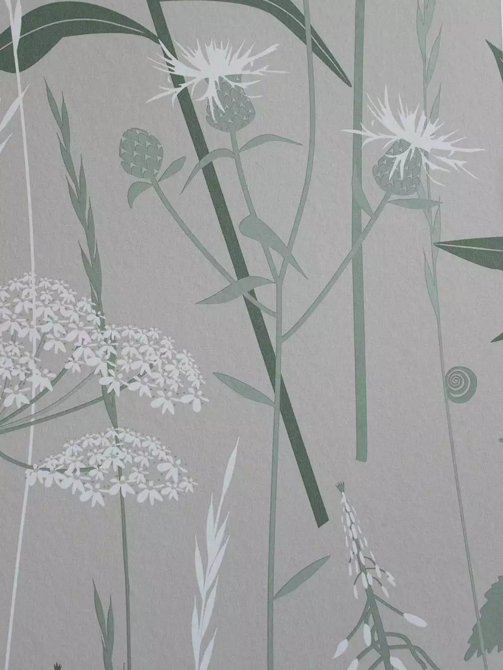 Wild Edge 'Nettle' zeigt Wildpflanzen und Blumen, die man sie im flirrenden Licht eines heißen Sommertags an einem wild blühenden Feldrand findet. Da gibt es Rosenweidenröschen , Gemeines Knabenkraut, Bärenklau, Nesseln, wilde Gräsern. Vielleicht entdecken Sie auch einen Käfer, eine kleine Motte oder eine Schnecke?! Denn was wäre eine auf einer Wildwiese ohne ein paar Lebewesen? Diese Farbvariante heißt ‚Nettle‘, mit grünen Blättern, weißen Blumen und einem haferfarbenem Hintergrund.