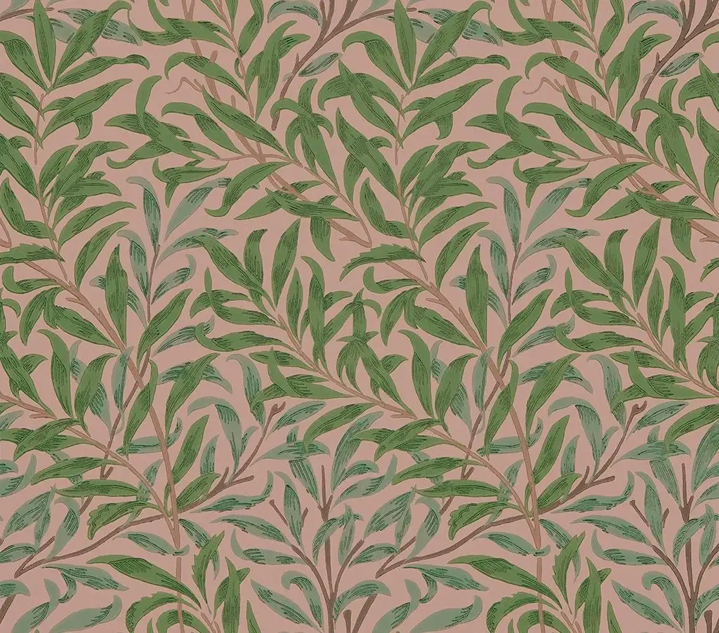 Die Tapete präsentiert eine botanische Ästhetik mit geschwungenen Weidenzweigen und Blättern, als wären sie vom Wind bewegt. Die Farbvariante ist eine gelungene Kombination von sanftem Rosa und frischem Blattgrün.