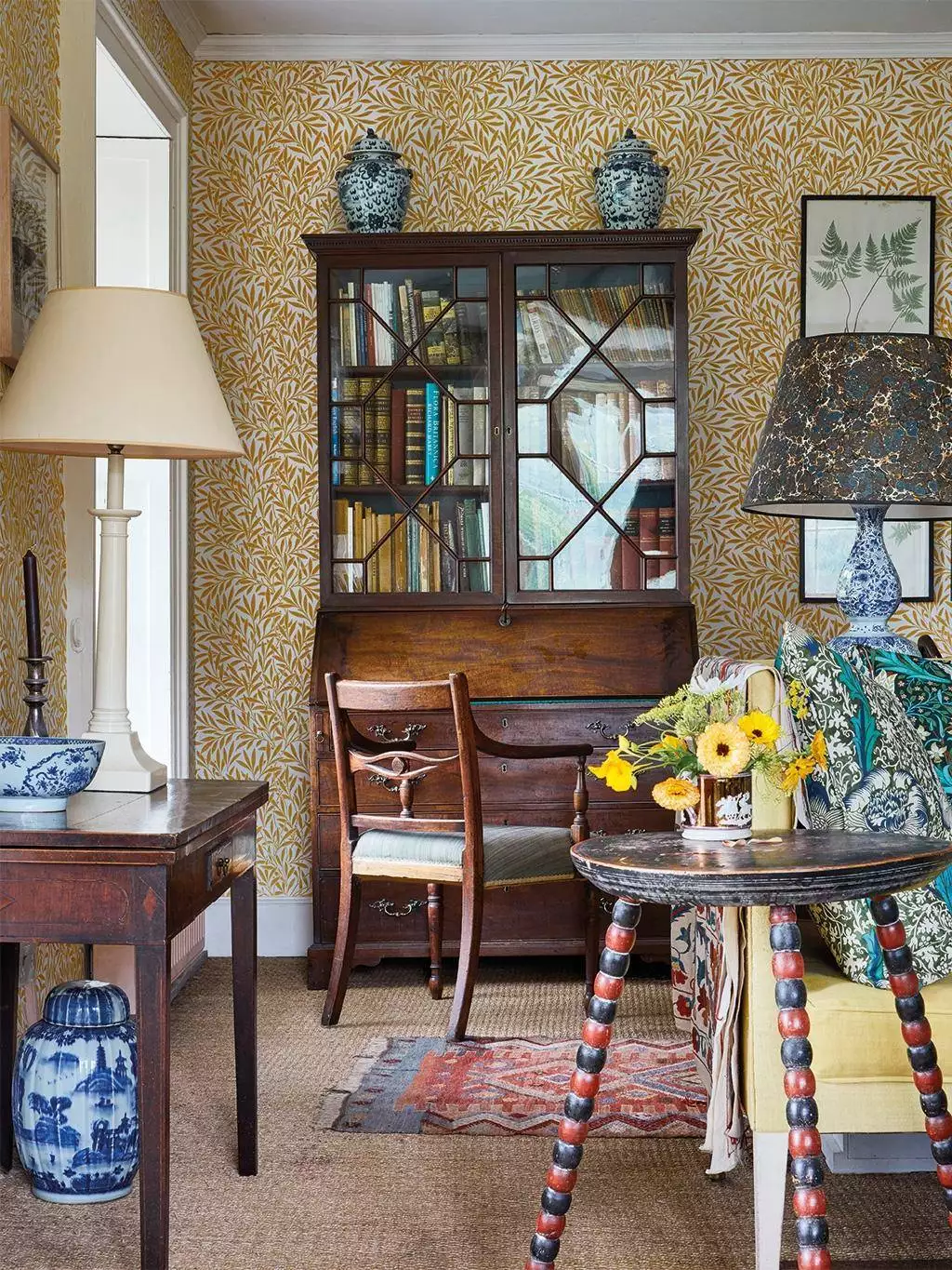 Als Teil der Ben Pentreath Kollektion, verlieh er dieser Tapete durch eine moderne Neuinterpretation in neutralem Sonnengelb ein zeitgemäßes Flair. Das Motv der Tapete sind Weidenblätter.