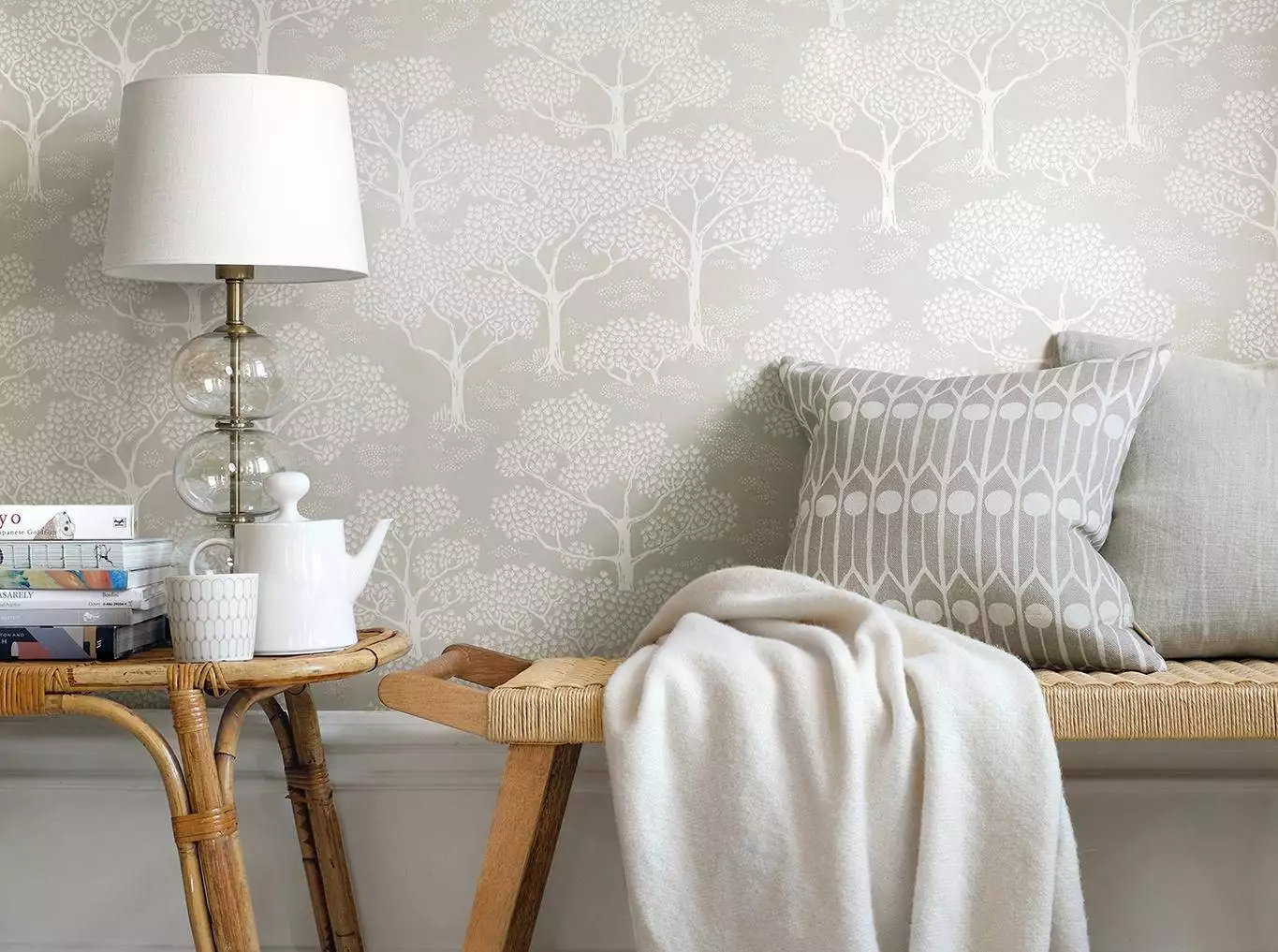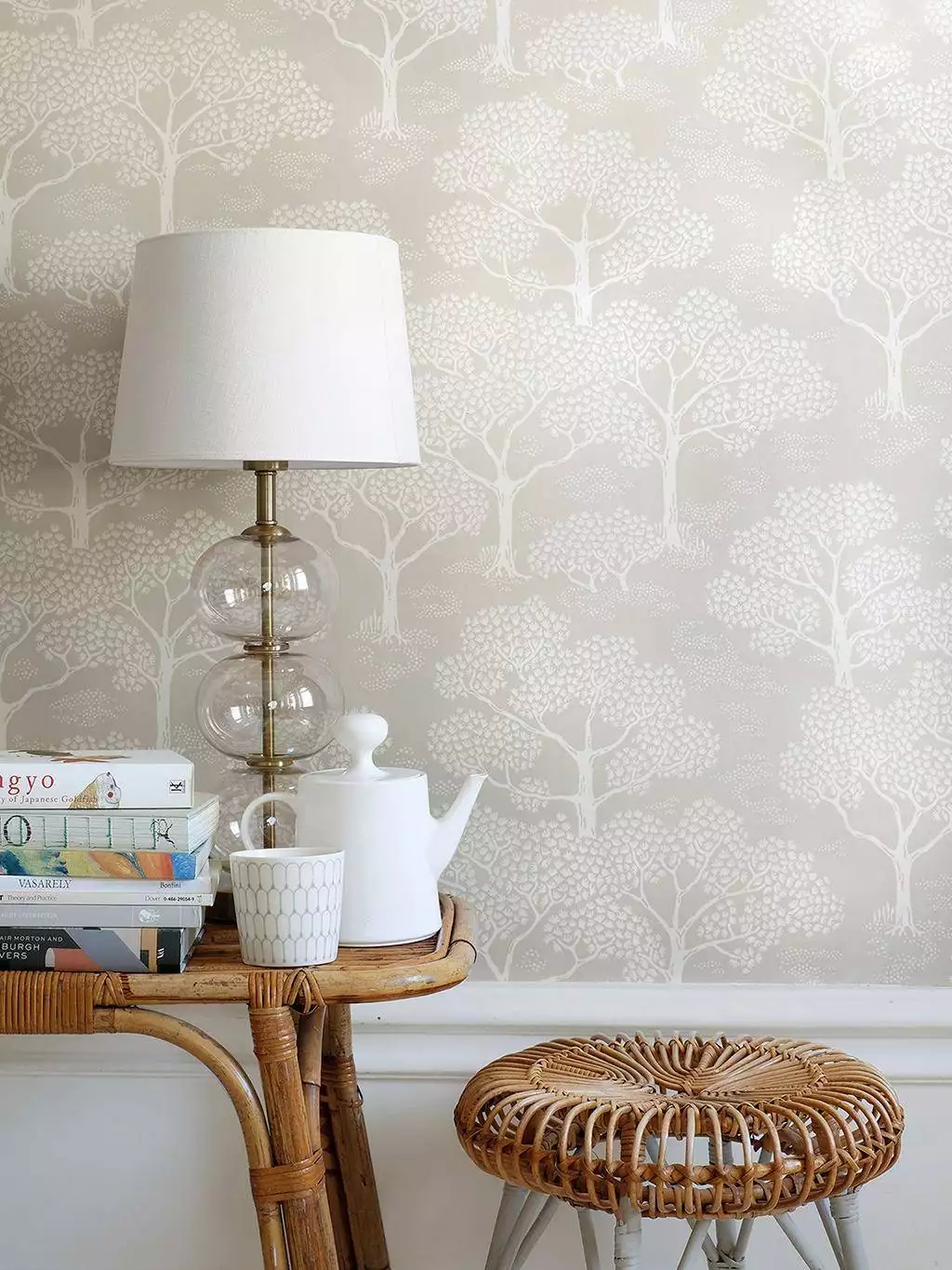 Die Tapete Woodland Notes Clay Beige bringt mit ihrer dezenten Waldszenerie eine ruhige, natürliche Stimmung in den Raum. Die sanften Beige- und Cremetöne wirken unaufdringlich und harmonisch, während das feine Baum-Muster eine stilvolle Tiefe schafft – perfekt für eine entspannte, wohnliche Atmosphäre.