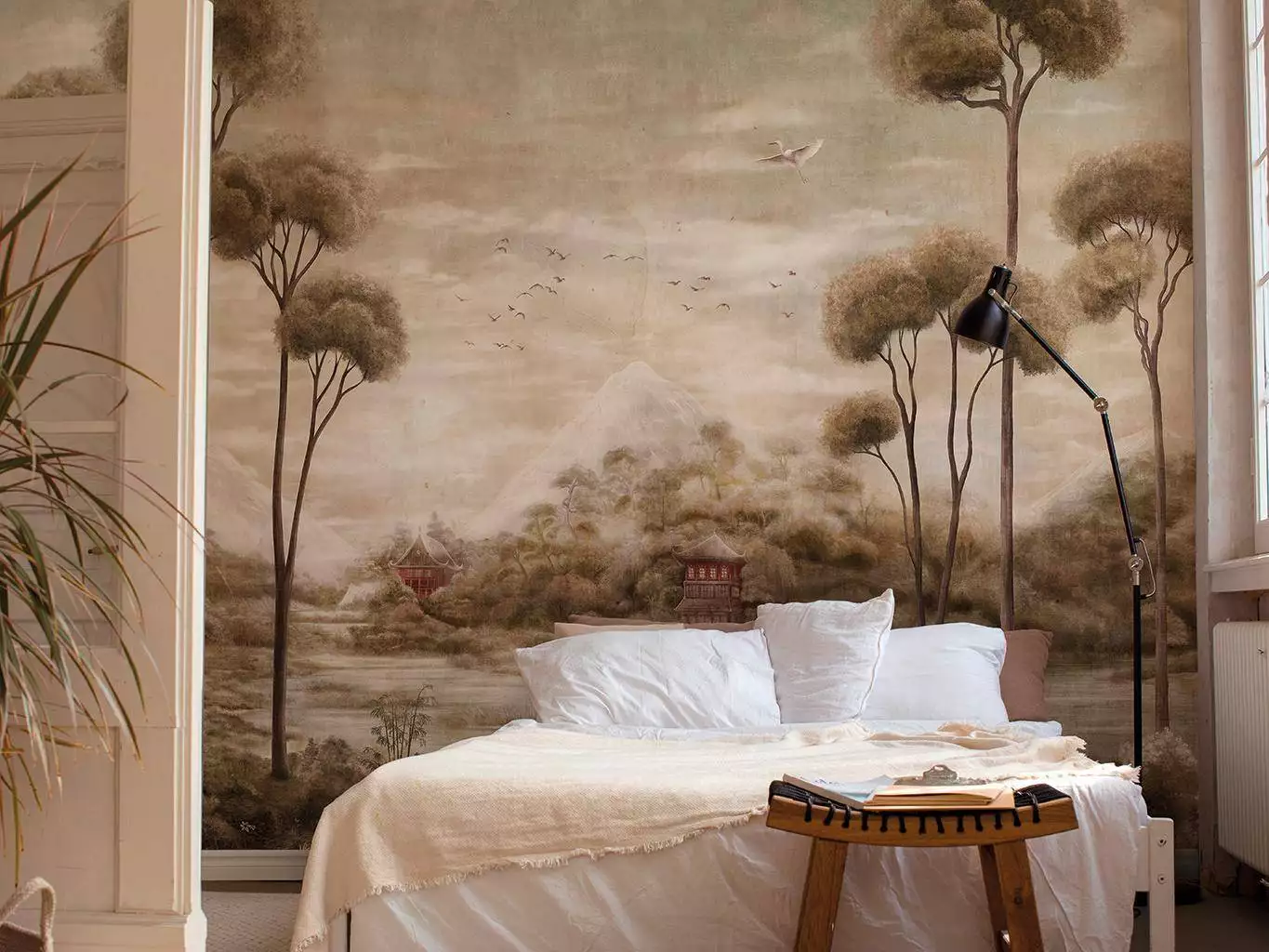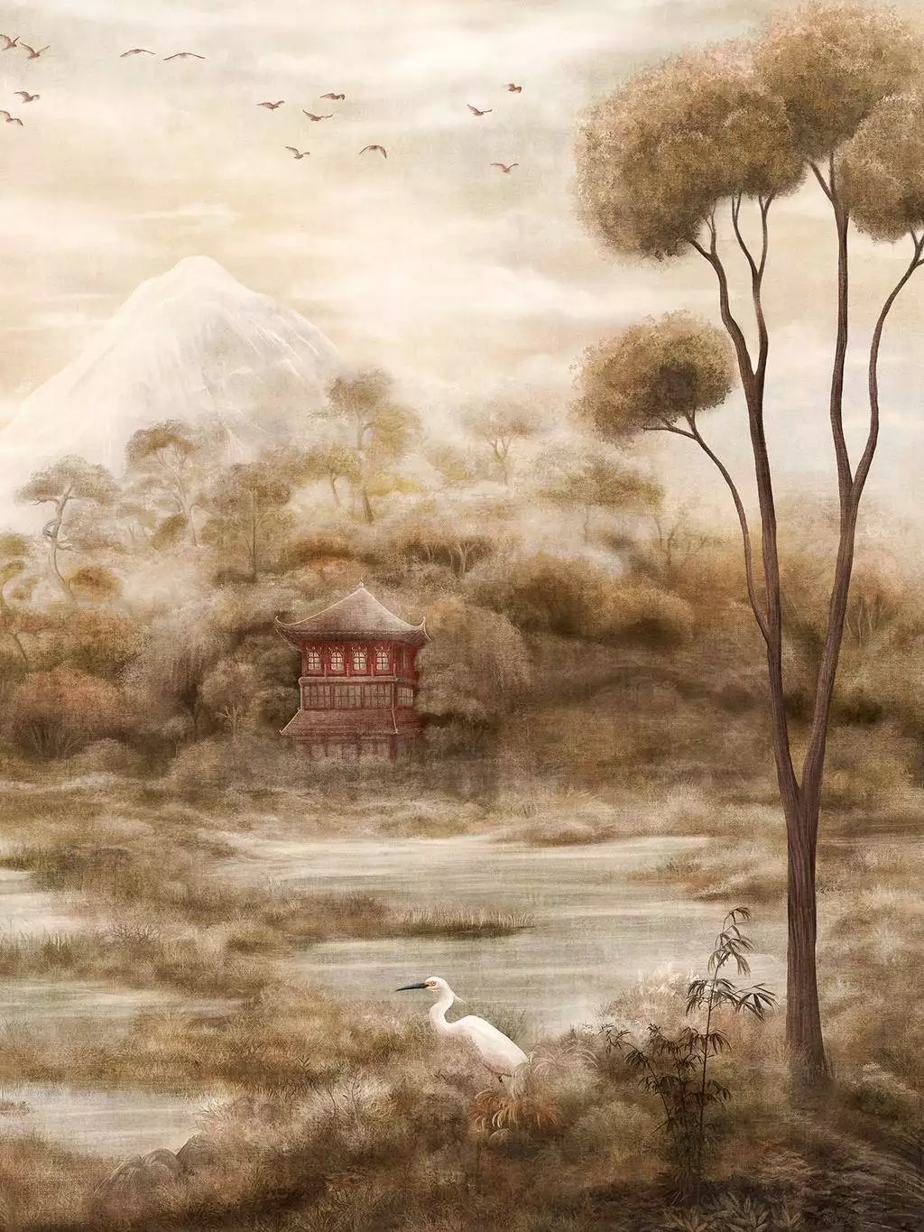Die Tapete Xi Hu Lake Amber aus der Kollektion Forbidden City von Coordonné entführt in eine verträumte Landschaft, die von fernöstlicher Malerei inspiriert ist. Das Design zeigt eine friedliche Szenerie mit eleganten Bäumen, spiegelnden Seen, Pagoden und sanften Bergketten im Hintergrund. Die warmen, bernsteinfarbenen Töne verleihen der Tapete eine beruhigende und einladende Atmosphäre, während Details wie Vögel und schimmernde Reflexionen eine dynamische Tiefe schaffen. Dieses Panorama eignet sich perfekt für Schlafzimmer oder Wohnräume, die Ruhe und Harmonie ausstrahlen sollen. Xi Hu Lake Amber verwandelt jeden Raum in eine Oase fernöstlicher Schönheit und Gelassenheit.