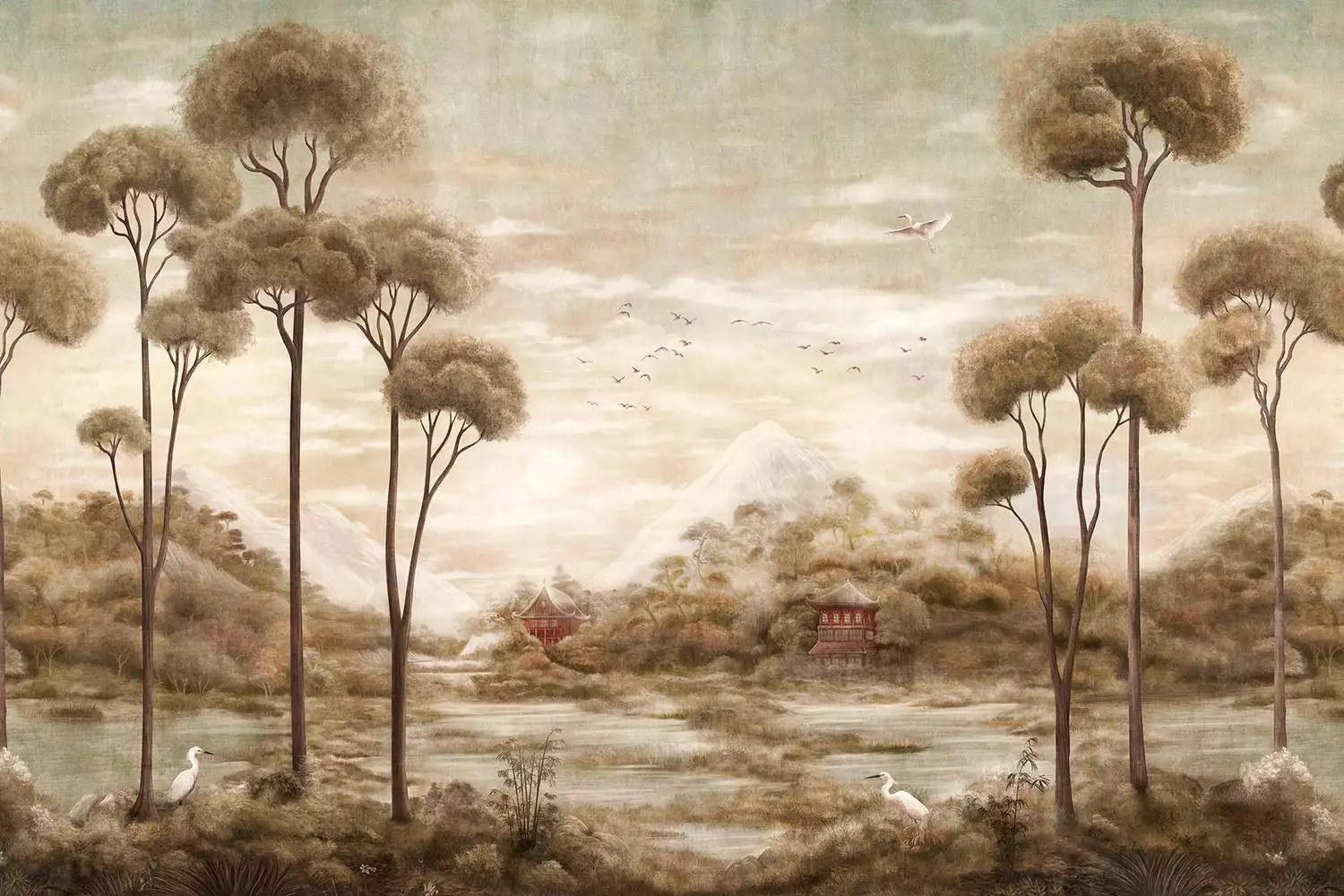 Die Tapete Xi Hu Lake Amber aus der Kollektion Forbidden City von Coordonné entführt in eine verträumte Landschaft, die von fernöstlicher Malerei inspiriert ist. Das Design zeigt eine friedliche Szenerie mit eleganten Bäumen, spiegelnden Seen, Pagoden und sanften Bergketten im Hintergrund. Die warmen, bernsteinfarbenen Töne verleihen der Tapete eine beruhigende und einladende Atmosphäre, während Details wie Vögel und schimmernde Reflexionen eine dynamische Tiefe schaffen. Dieses Panorama eignet sich perfekt für Schlafzimmer oder Wohnräume, die Ruhe und Harmonie ausstrahlen sollen. Xi Hu Lake Amber verwandelt jeden Raum in eine Oase fernöstlicher Schönheit und Gelassenheit.