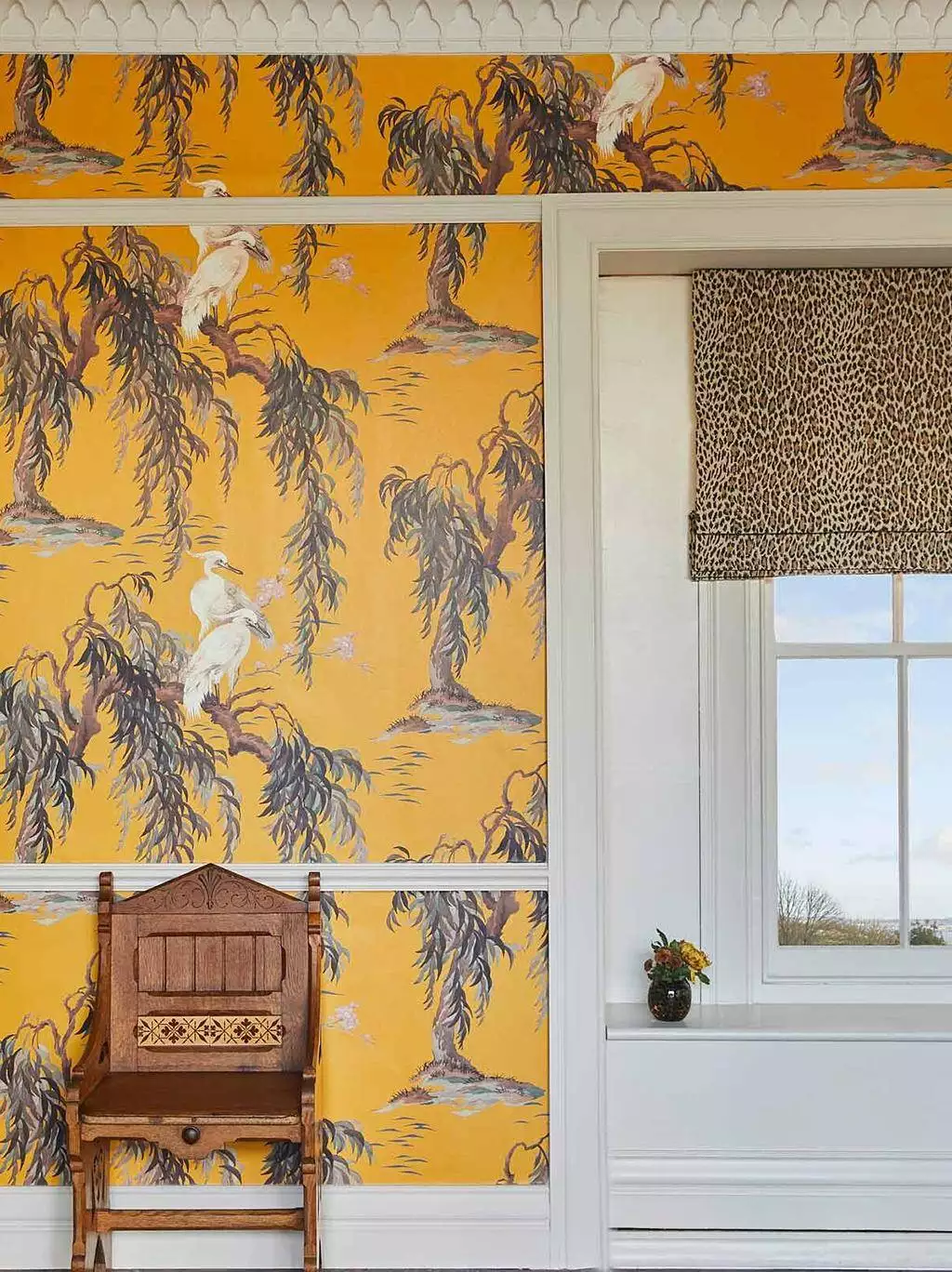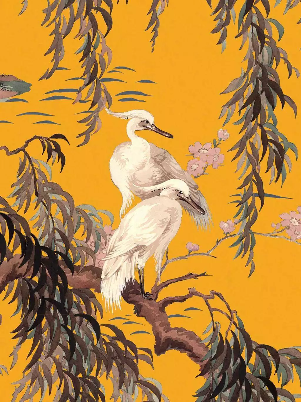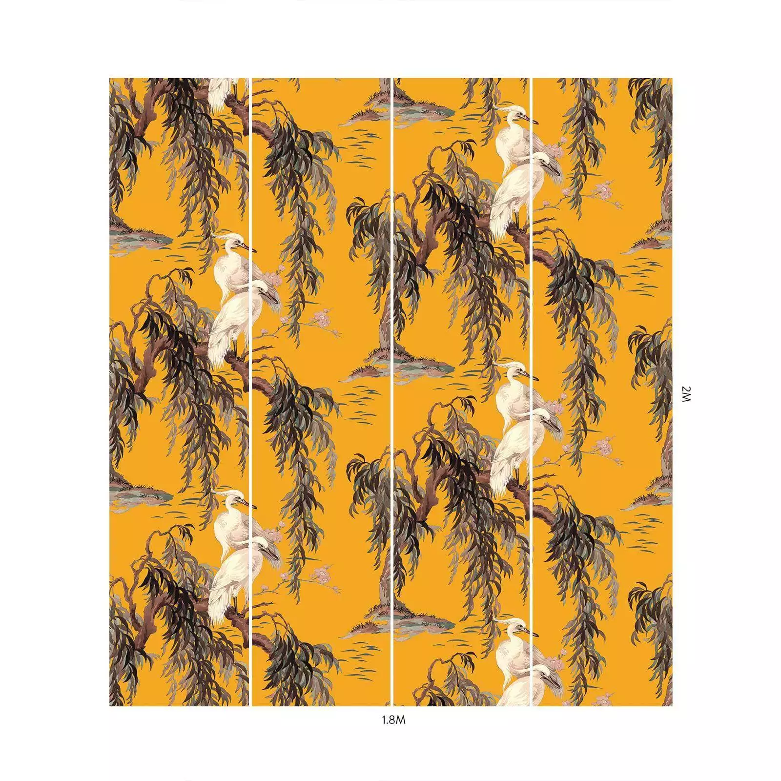 Die Tapete Zeus im Farbton Ochre von House of Hackney verbindet ästetisches Design, asiatische Eleganz und Natur. Zwei Kraniche ruhen auf einem Ast, umgeben von zarten Blüten und sanft herabhängenden Weidenzweigen vor einem Grund, der an die Farben eines Sonnenuntergangs erinnert. Kunstvoll in Aquarelltechnik handgemalt, entsteht ein Landschaftsszenerie, die von fernöstlicher Ästhetik inspiriert ist. Die matte Vliestapete bringt eine Atmosphäre von Ruhe und Harmonie in Ihre Räume – ideal für eine luxuriöse Wandgestaltung im Wohnzimmer, Schlafzimmer oder Essbereich. Sie wird im praktischen Set aus 4 Bahnen (je 0,45 x 3,00 m) geliefert. Sets lassen sich nahtlos erweitern, wodurch die Wandgestaltung einfach und präzise gelingt.