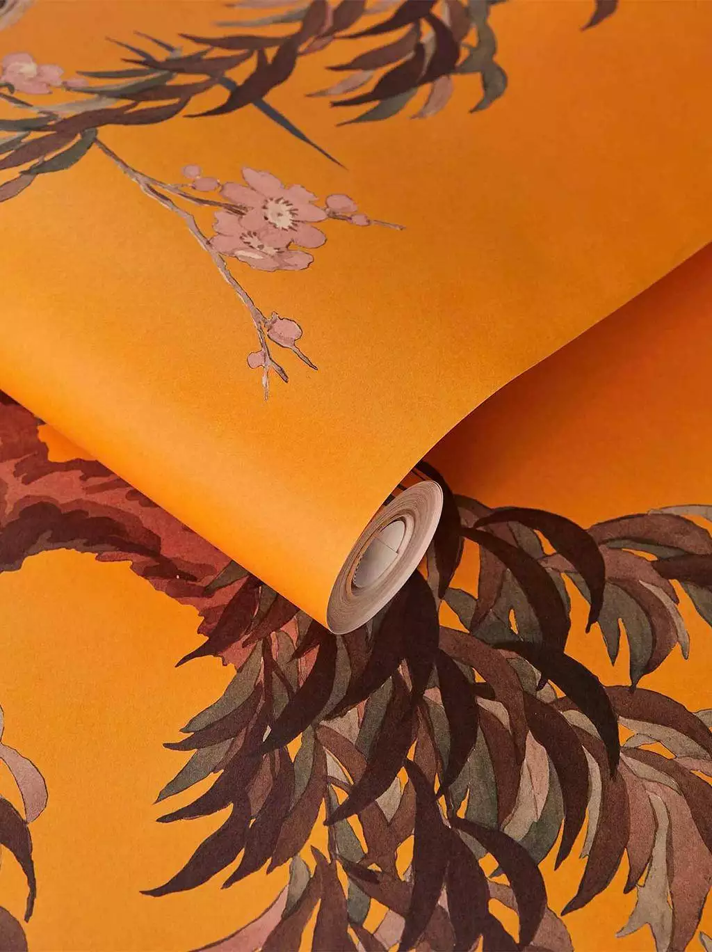 Die Tapete Zeus im Farbton Ochre von House of Hackney verbindet ästetisches Design, asiatische Eleganz und Natur. Zwei Kraniche ruhen auf einem Ast, umgeben von zarten Blüten und sanft herabhängenden Weidenzweigen vor einem Grund, der an die Farben eines Sonnenuntergangs erinnert. Kunstvoll in Aquarelltechnik handgemalt, entsteht ein Landschaftsszenerie, die von fernöstlicher Ästhetik inspiriert ist. Die matte Vliestapete bringt eine Atmosphäre von Ruhe und Harmonie in Ihre Räume – ideal für eine luxuriöse Wandgestaltung im Wohnzimmer, Schlafzimmer oder Essbereich. Sie wird im praktischen Set aus 4 Bahnen (je 0,45 x 3,00 m) geliefert. Sets lassen sich nahtlos erweitern, wodurch die Wandgestaltung einfach und präzise gelingt.