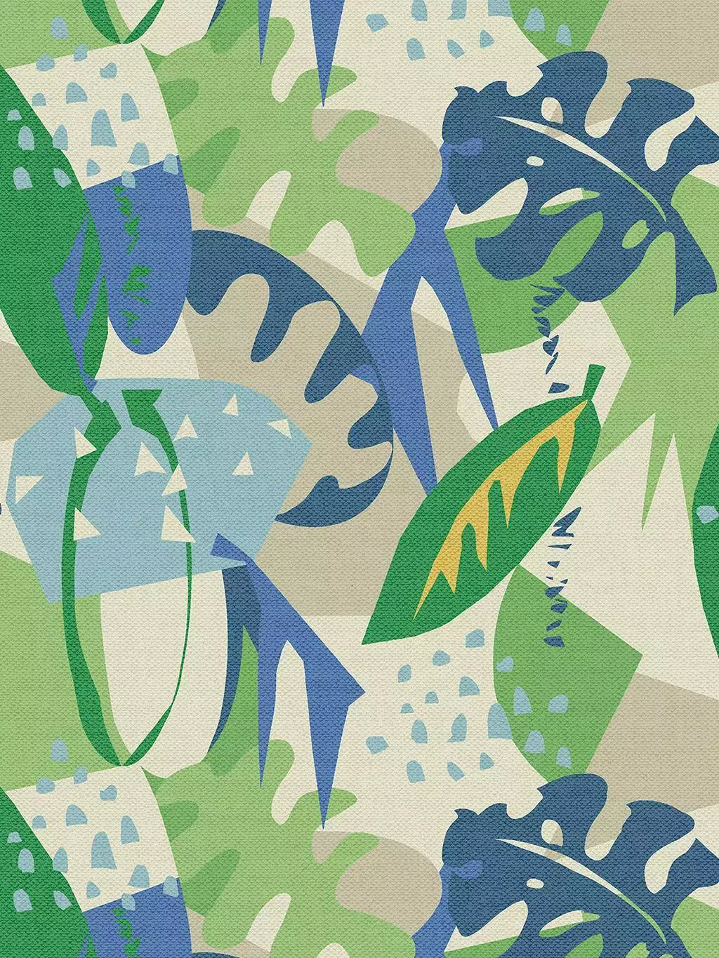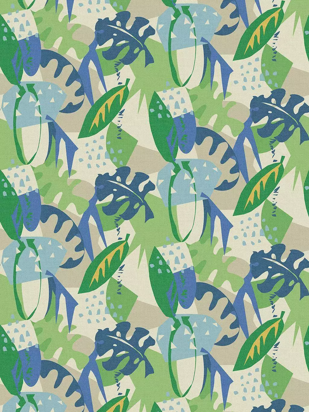 Abstrakte Blattformen, handgeschnitten aus Papier, bilden eine lebendige Collage. Die bunten, gedruckten Elemente sind kreativ arrangiert und erzeugen ein dynamisches Bild.
